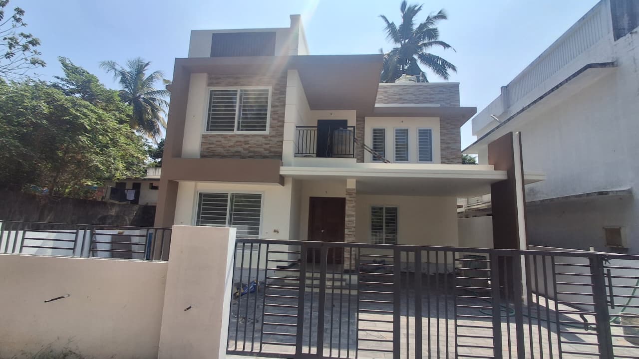 New Semi furnished 3 bedrooms, 1800Sqft, 5.5cent, newly villa located at Amala Thrissur. This villa consists of generous living, stylish finished Dining, Kitchen cabinets, Kitchen platform with black granite counter top and stainless steel sink, wardrobes, 3bathroom, common toilet, Balcony, wide work area, tar road access, throughout the year Unlimited natural water supply through the internal pipeline from the open well. All the amenities that make life more pleasurable have been incorporated. This is a really stunning and beautiful house design with lots of latest facilities.