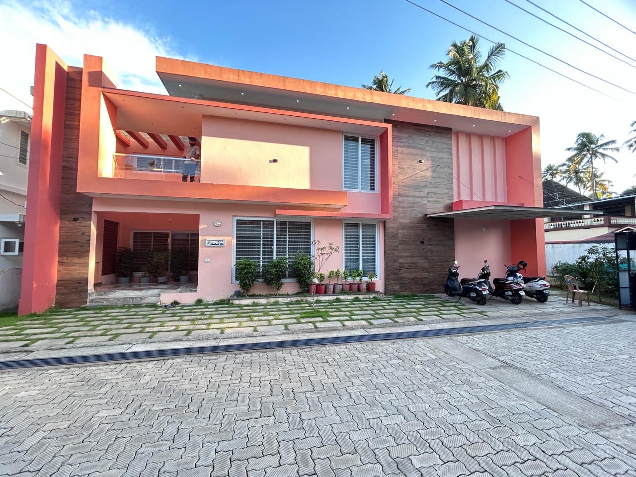 villa located at Chittilappilly Amala Thrissur. 2900SqFt, 6.4 Cent Fully-furnished, posh villa got 4 bedroom, generous living space, stylish finished Dining, Kitchen platform with black granite counter top and stainless steel sink with single bowl and drain board, wardrobes, 4bathroom, common toilet, generous Balcony, wide work area, furniture include: 4 Cot, dining table with chair, 2 sofa settee,4geyser,refrigerator,2AC, light and fittings, curtains, wardrobes, 3 bathroom, common toilet, generous Balconies, brand vitrified tiles in sitout, living, dining, bedrooms, kitchen and balcony and ceramic tiles in toilets and work area, Plastic emulsion paint for wall and ceiling, AC provision in all bedroom, tar road access, Surrounded compound wall with entrance gate, Unlimited natural water supply through the internal pipeline from the open well. This home beautifully planned that whenever you step out you witness an abundance of verdant greens.